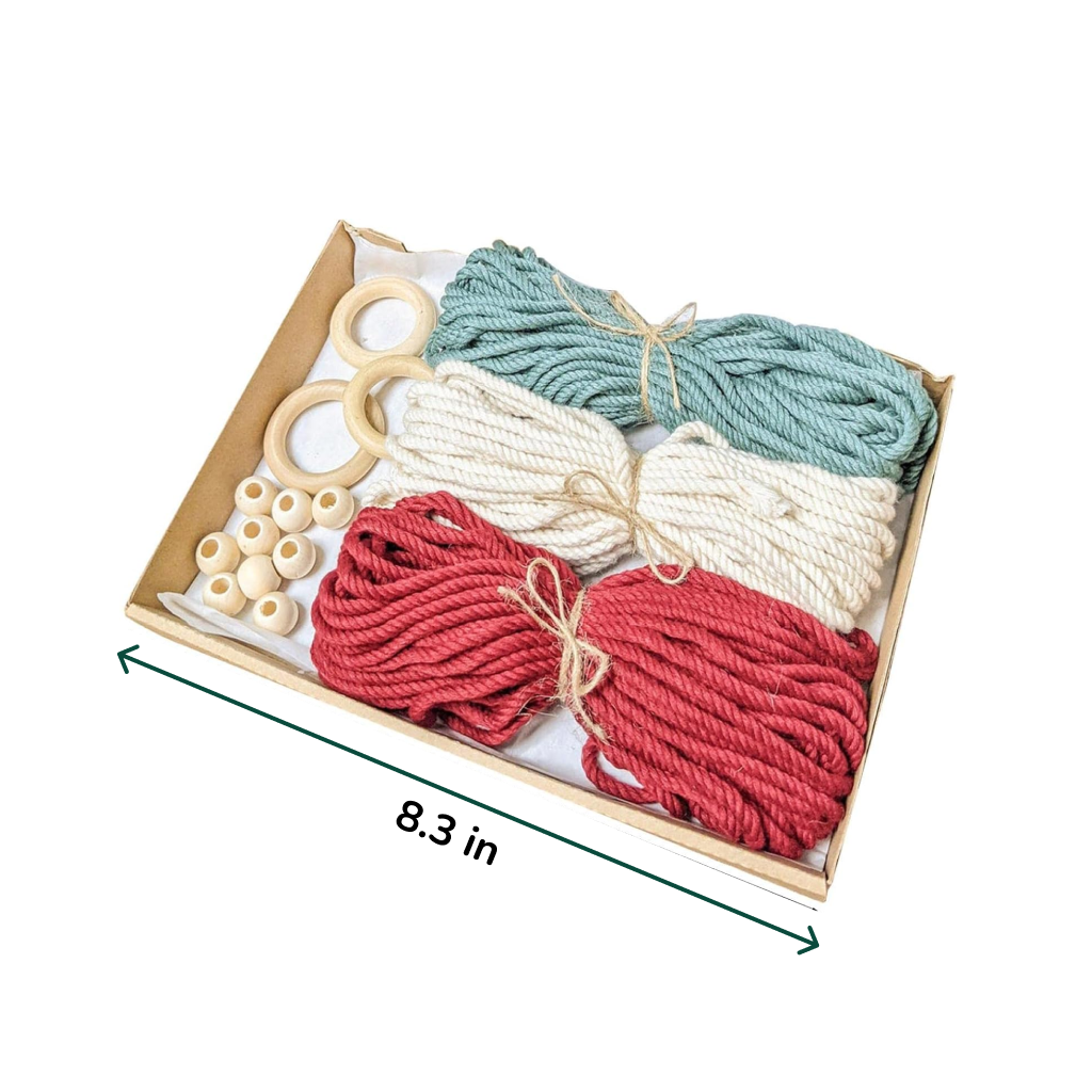 – Includes green, white, and red macrame string, rings, and beads.