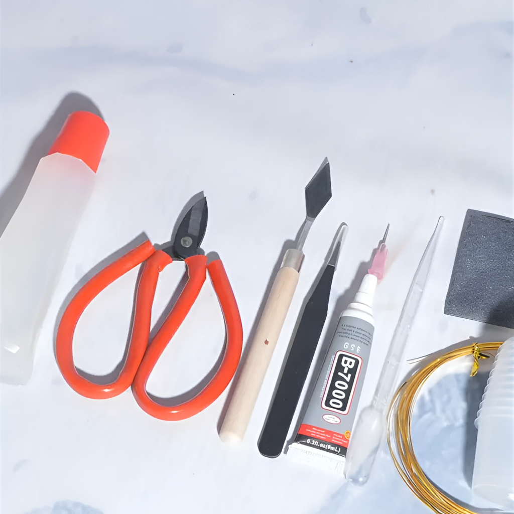 Includes: Glue, Scraper, Wire, Tweezers, Scissors, Mixing Cup, Dropper, Colored Sand