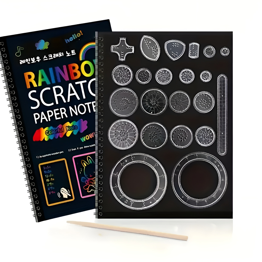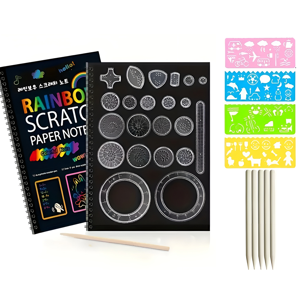 Includes: 10 pcs Scratch papers, 4 drawing stencils, 5 wooden styluses, 22 plastic drawing guides