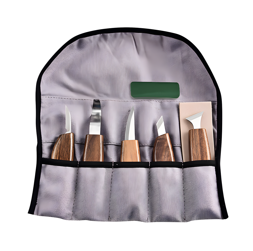 Includes: 5 wood carving knives, 1 storage bag, 2 knife sharpeners