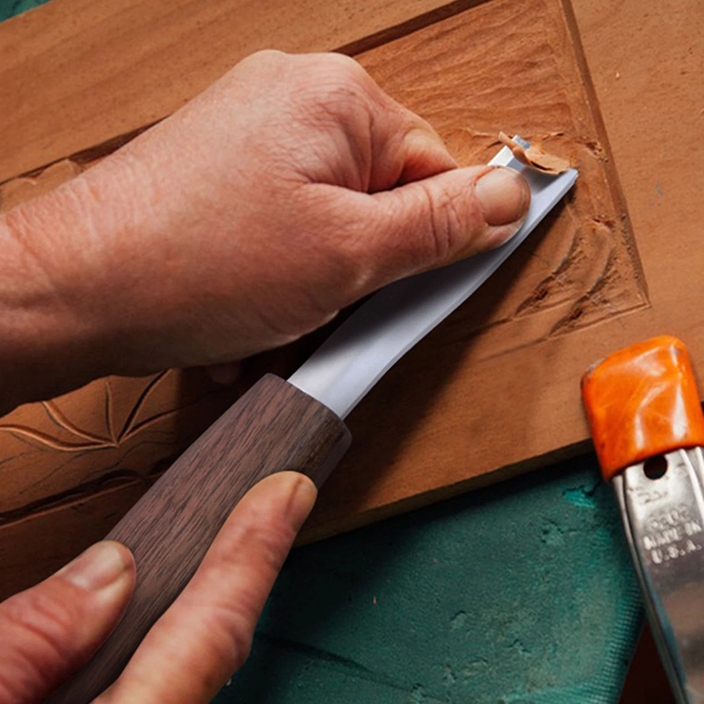 Curved blade designed to carve clean, smooth concave surfaces with ease.